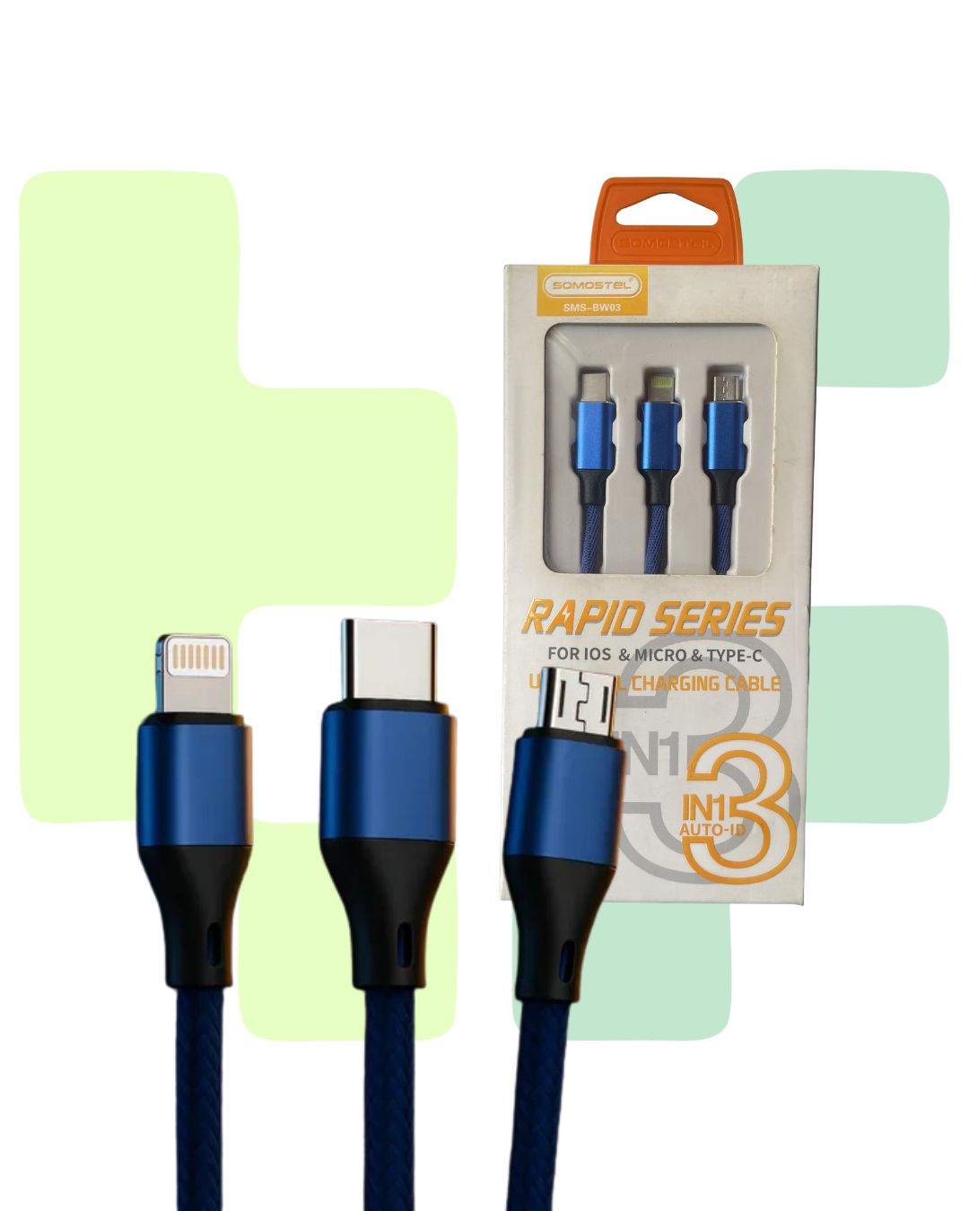 Cable con entrada usb y salida V8, tipo c y iOS 1.2 metros Cable tipo cordón Amperaje:3.4